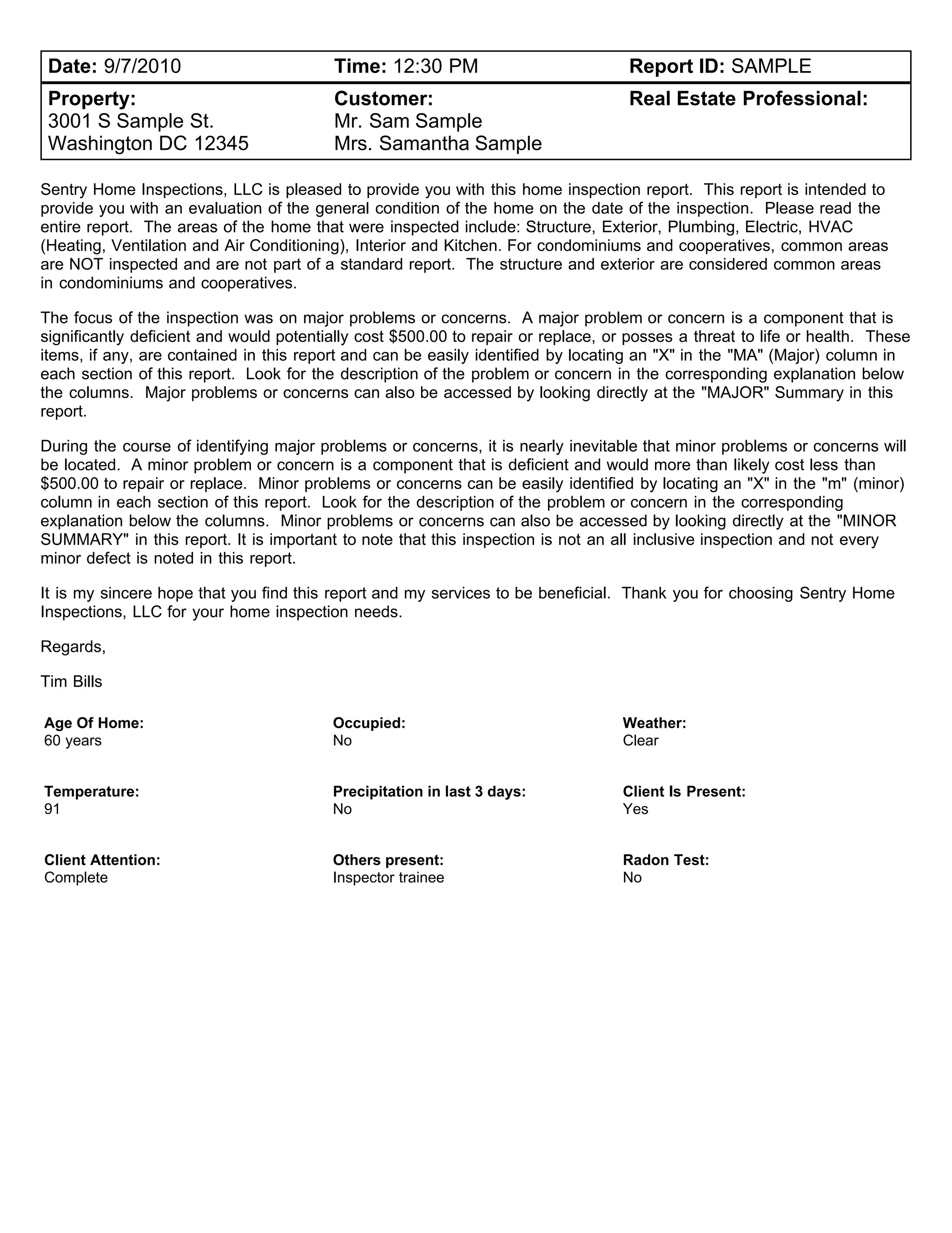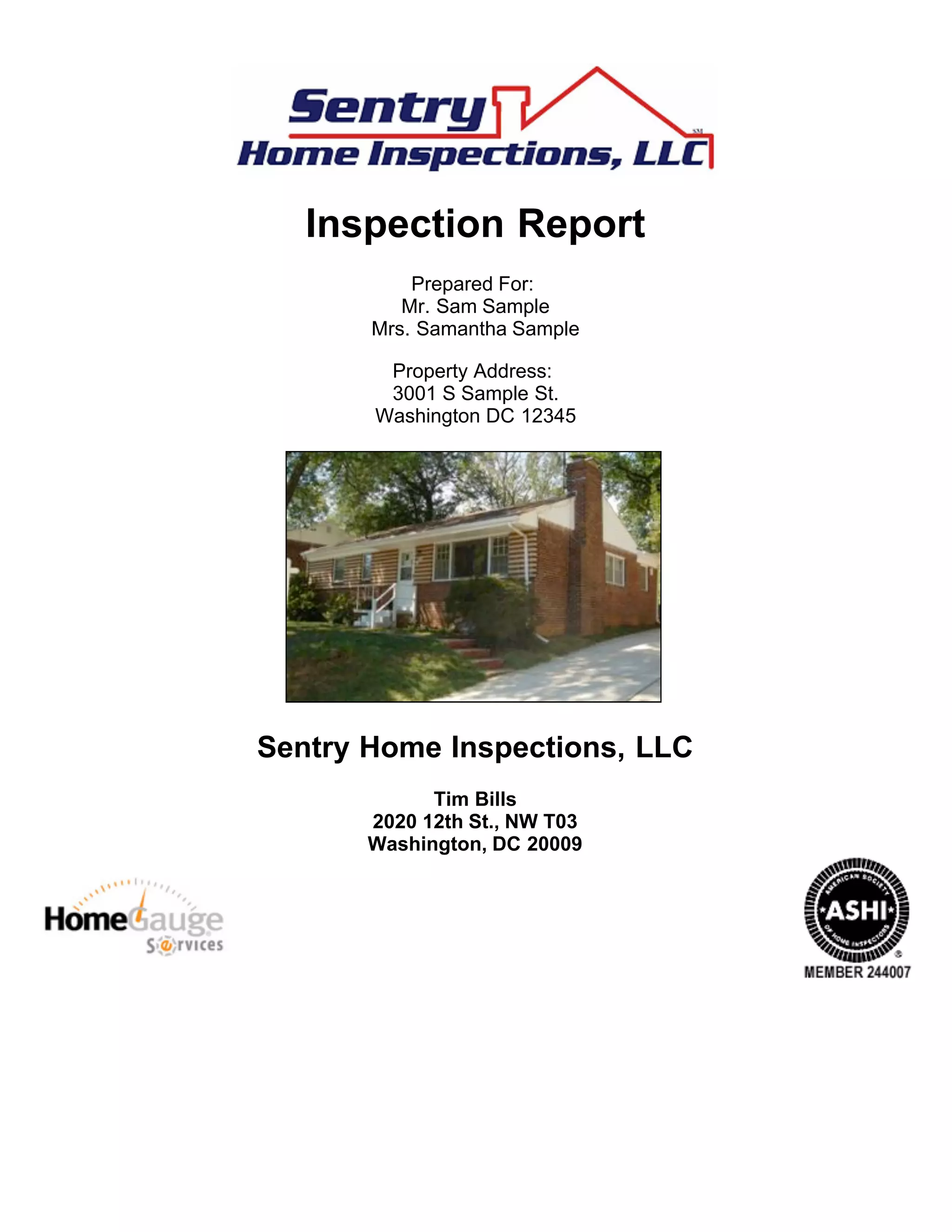 The inspection report summarizes the inspection of a 60-year-old home located at 3001 S Sample St. in Washington DC. The inspector found minor issues with the roof, exterior, plumbing, electric, and HVAC systems. The furnace and air conditioner were inoperative. Recommendations included extending downspouts away from the foundation, repairing damaged roof shingles, sealing plumbing vent leaks, cleaning the dryer vent, and routine HVAC maintenance.