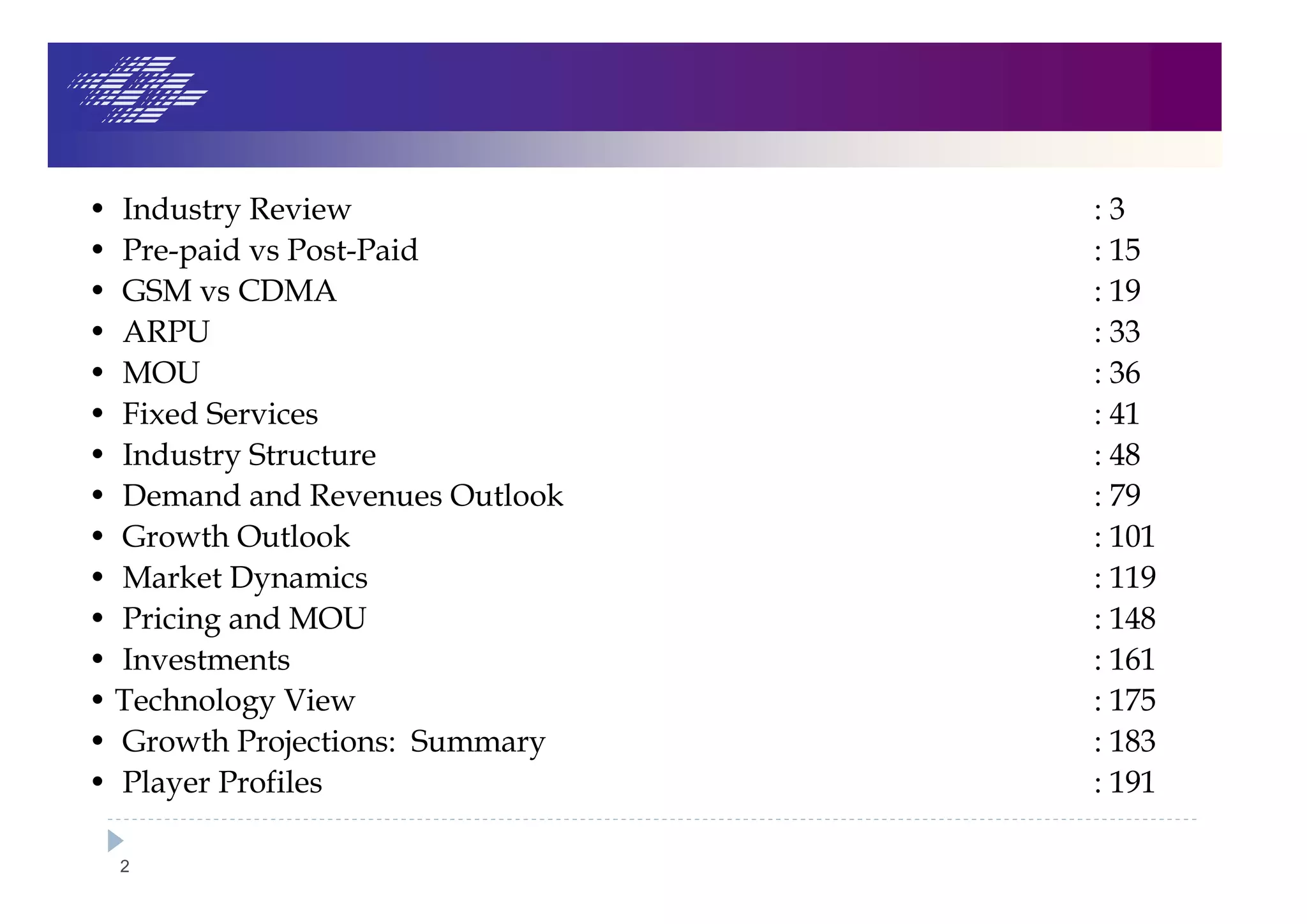 This document provides an overview of the telecom industry in India, including trends in mobile and fixed subscribers, ARPU, MOU, and market share by technology and operator. Some key points: