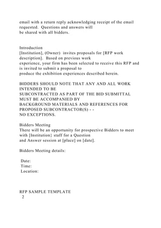 This document is a sample Request for Proposals (RFP) template for a fabrication project, outlining key dates, submission guidelines, and requirements for bidders. It includes details on the meeting schedule, the scope of work needed for various exhibitions, and documentation standards for proposals. Bidders must provide comprehensive proposals that adhere to specific guidelines and will undergo evaluation by the issuing institution.