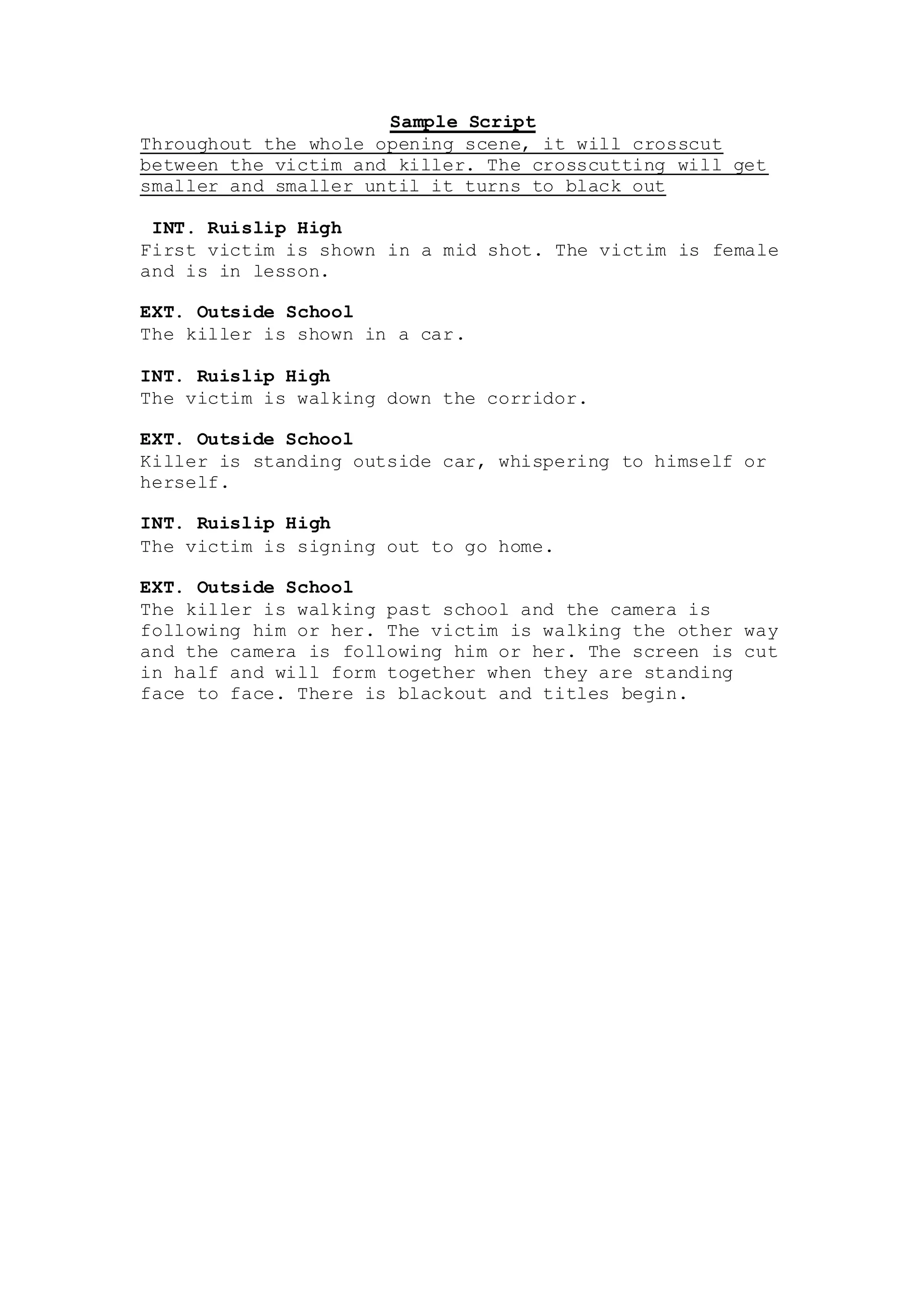The script crosscuts between a victim at school and a killer outside, with shots getting closer until they meet face to face. It shows the female victim in class and the killer whispering to themselves near the school. As the victim signs out to leave, the killer is walking past the school and the camera follows both of them until they stand together, at which point the screen cuts to black.
