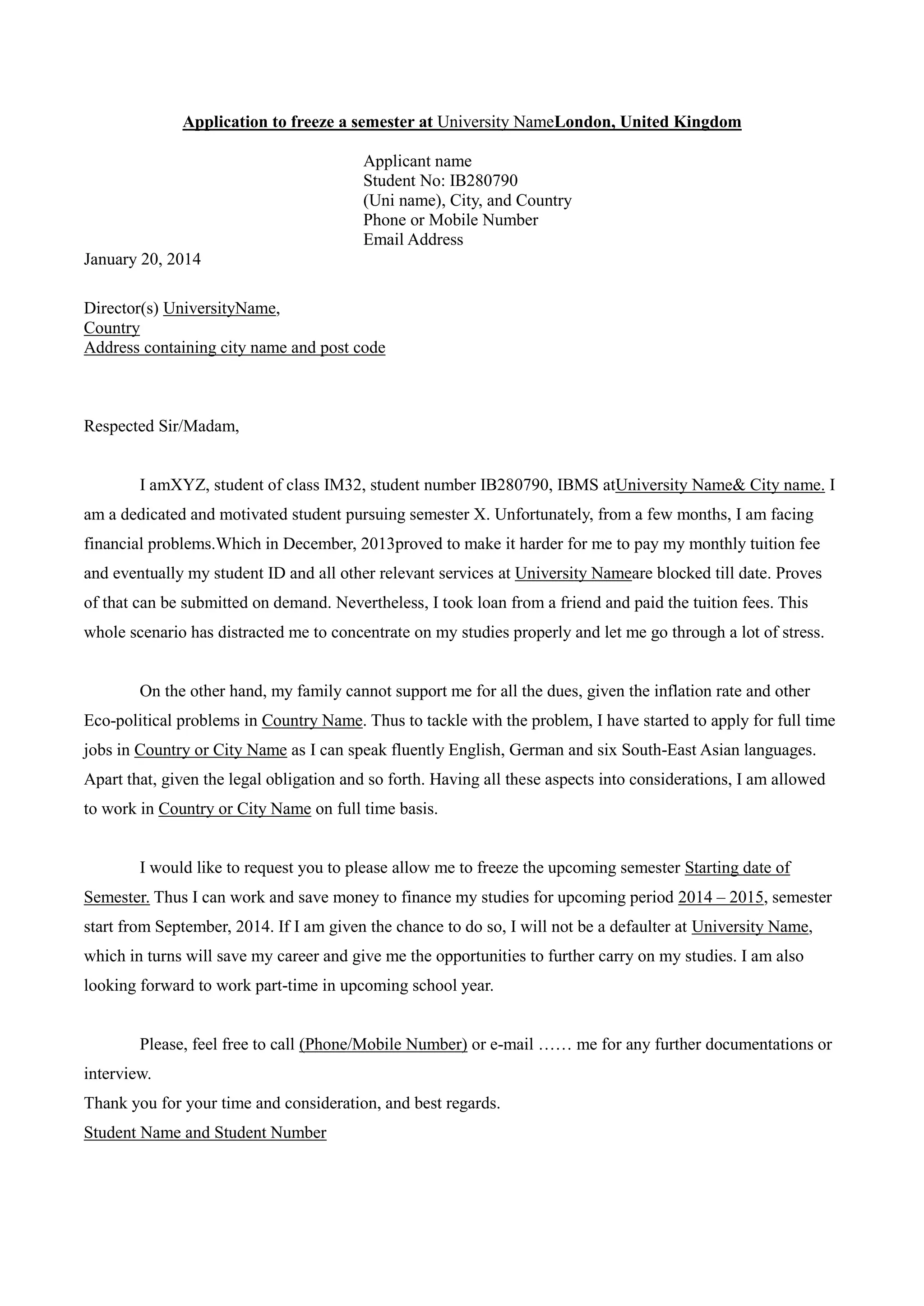 The student is requesting to freeze the current semester at the University due to financial difficulties. They have been facing financial problems for the past few months which led to their student account being blocked until tuition fees were paid through a loan. This has caused stress for the student and their family is unable to support them further due to economic conditions in their home country. Freezing the current semester would allow the student to work full-time to earn money and finance their studies for the upcoming academic year starting in September 2014. The student is asking for the director's approval of their request so that they can continue their education without defaulting on their tuition.