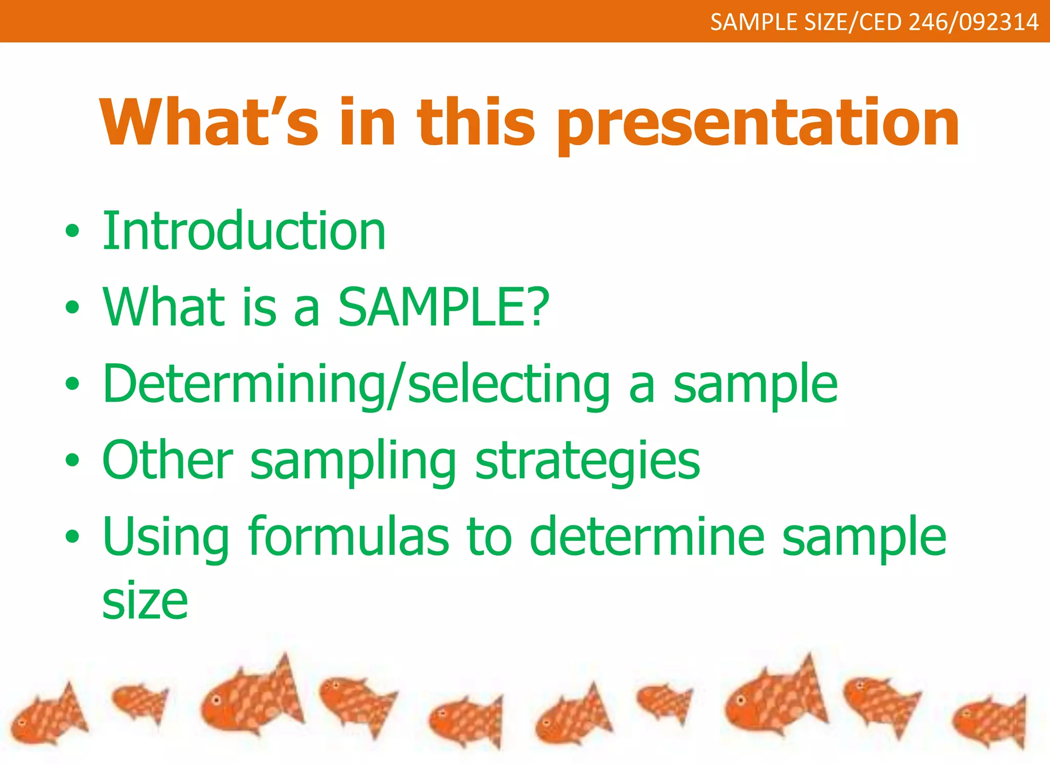 This document discusses sample size and determining an appropriate sample size for evaluation purposes. It introduces the concepts of a sample, population size, precision level, confidence level, and variability in determining sample size. Several sampling strategies are presented, including probability and non-probability sampling. Formulas are provided for calculating sample size, such as Slovin's formula and Cochran's formula which take into account factors like margin of error, population size, and degree of variability. Guidelines are given for selecting an appropriate sample size based on the purpose of the study and available population.
