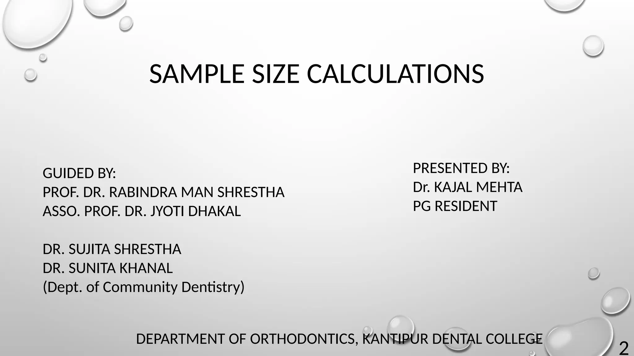 This document presents an overview of sample size calculations essential for research methodology, exploring concepts such as sample definition, various sampling techniques, and the importance of determining an optimum sample size. It details when and how to calculate sample size, the significance of error types, and methods to enhance study validity, while also providing specific formulas and examples for different study designs. The conclusion emphasizes that accurately calculating sample size is crucial for meaningful and cost-effective research outcomes.