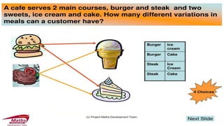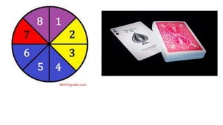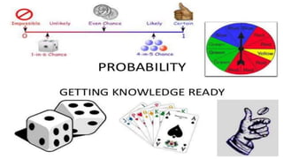 Probability is a branch of mathematics that deals with describing how likely events are to occur. An experiment is a process with uncertain outcomes, while an outcome is any possible result. The sample space is the set of all possible outcomes. Fundamental counting principles state that if one event can occur in m ways, a second in n ways, and a third in p ways, the total number of outcomes is m x n x p. Probability is calculated by dividing the number of favorable outcomes by the total number of possible outcomes.