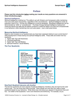 This document provides an interpretive report for a Spiritual Intelligence Assessment. It discusses the assessment's measurement of 21 skills across 4 quadrants that combine to create spiritual intelligence. The report analyzes the respondent's scores in each skill and provides next step suggestions. It emphasizes that spiritual growth is personal and the assessment is meant to facilitate self-reflection rather than dictate beliefs.