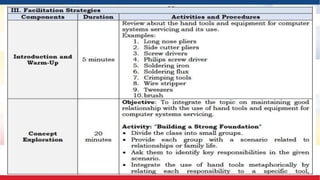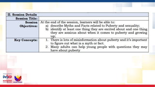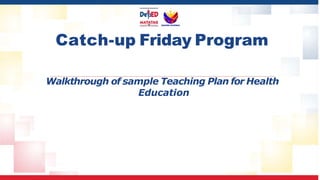 This document provides an orientation for a pilot implementation of the Matatag curriculum. It includes a walkthrough of a sample Teaching Plan for Health Education. The plan suggests strategies for teaching health education such as mindfulness activities, engaging medical practitioners, inviting healthcare professionals to speak, film/movie viewing, role-playing, physical activities, and case analysis. Reference materials are also provided.