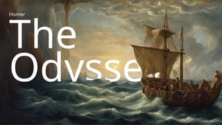 The document discusses Homer's 'The Odyssey,' focusing on the character of Odysseus and his ten-year journey home after the Trojan War, which involved various challenges and the struggle of his family during his absence. Key themes such as heroism, loyalty, and the importance of home are highlighted, along with notable characters like Penelope, Telemachus, Athena, and Poseidon. Additionally, it references various adaptations inspired by the story, showcasing its lasting legacy in literature and culture.