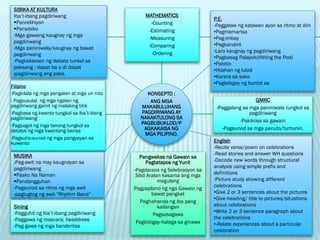 Ang dokumento ay tumatalakay sa mga makabuluhang pagdiriwang bilang kasangkapan sa pagkakaisa ng mga Pilipino. Naglalaman ito ng mga mungkahi sa iba't ibang asignatura tulad ng Matematika, Filipino, PE, Musika, at Sining na nakaangkla sa tema ng pagdiriwang. Kasama rin ang mga aktibidad at gawain na nagpapayaman sa kaalaman at karanasan ng mga mag-aaral hinggil sa mga lokal na pagdiriwang.