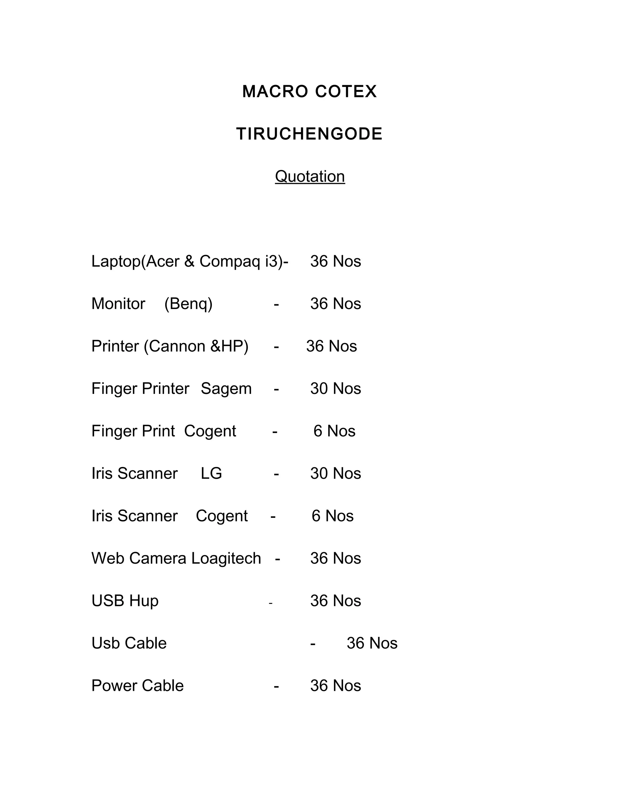This document appears to be a quotation for various technology equipment including 36 laptops, 36 monitors, 36 printers, 30 fingerprint scanners of one brand and 6 of another, 30 iris scanners of one brand and 6 of another, 36 web cameras, 36 USB hubs, 36 USB cables, and 36 power cables. The rate per kit of all this equipment is quoted at 75,000 rupees.