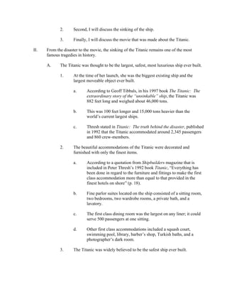 The document provides an outline for an informative speech about the Titanic. It begins with an introduction that discusses how a book predicted the Titanic disaster and establishes the importance of learning about history. The outline then details the three main points that the speech will cover: 1) the Titanic ship itself, how it was considered luxurious and unsinkable, 2) the sinking, how it struck an iceberg and sank despite having safety features, and most passengers had no escape, and 3) the movie made about the Titanic, how it was directed by James Cameron and involved extensive research and the construction of a full-scale ship replica.