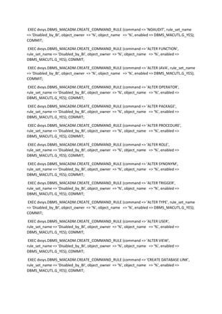 The document creates several rules, rule sets, and a realm to control access to BI (Business Intelligence) objects and processes in the database. It defines rules for BI users and processes, privileged database users, and BI data owners. It then adds these rules to rule sets to restrict or allow certain commands. Finally, it creates a realm to protect BI data and grants access to the realm to specific BI administrative users and schemas.