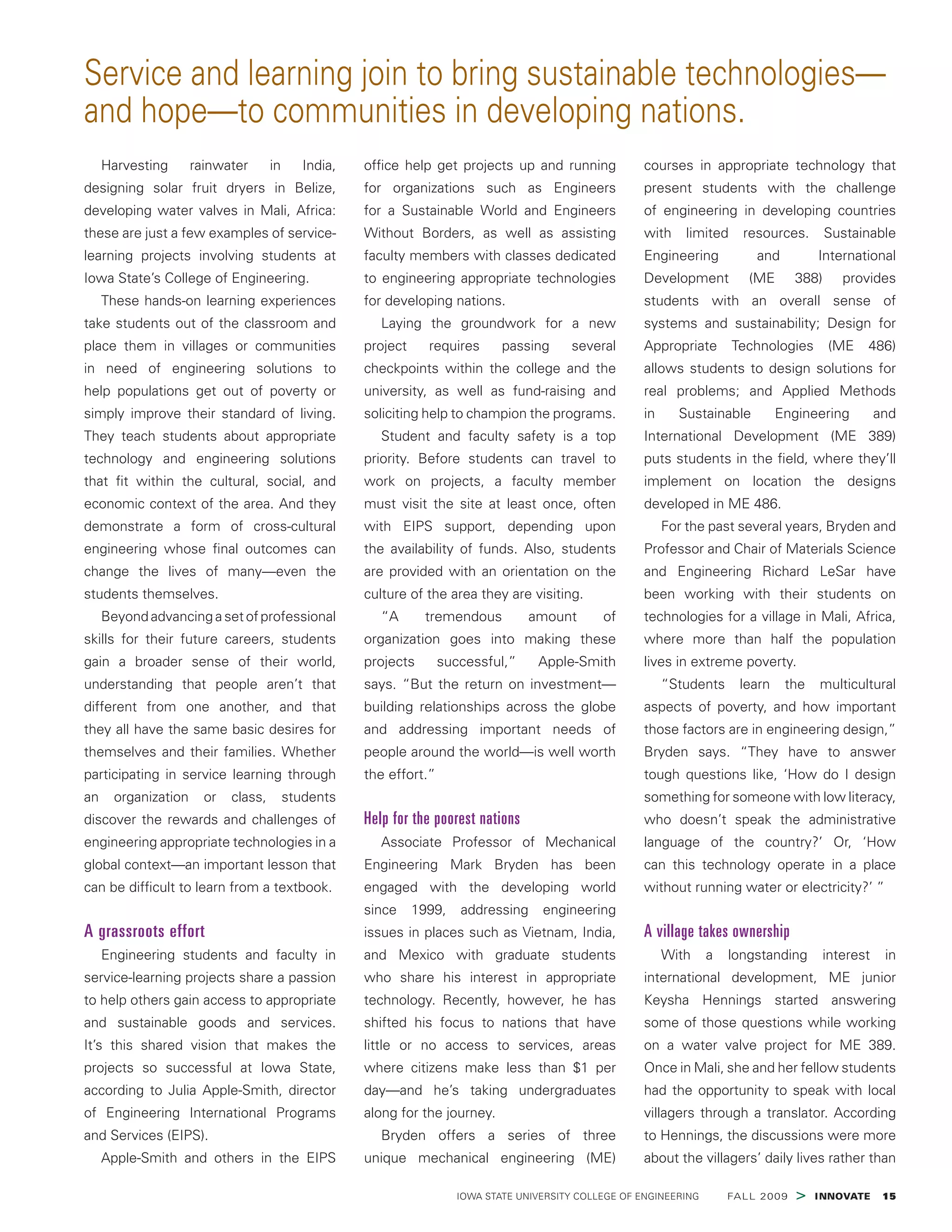 1) Engineering students at Iowa State University gain hands-on experience designing appropriate technologies for developing communities through service-learning projects with organizations like Engineers Without Borders and Engineers for a Sustainable World.