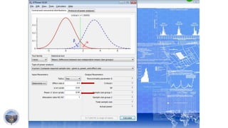 This document discusses factors to consider when determining sample size for research, including effect size, population standard deviation, power, and significance level. It provides examples of how to estimate these factors from literature, historical data, or expert opinion. Free online sample size calculators and software tools are listed. Steps for determining sample size include understanding the study objective, selecting the appropriate statistical analysis, calculating the sample size, and allowing for non-response. Sample size statements should outline these steps.