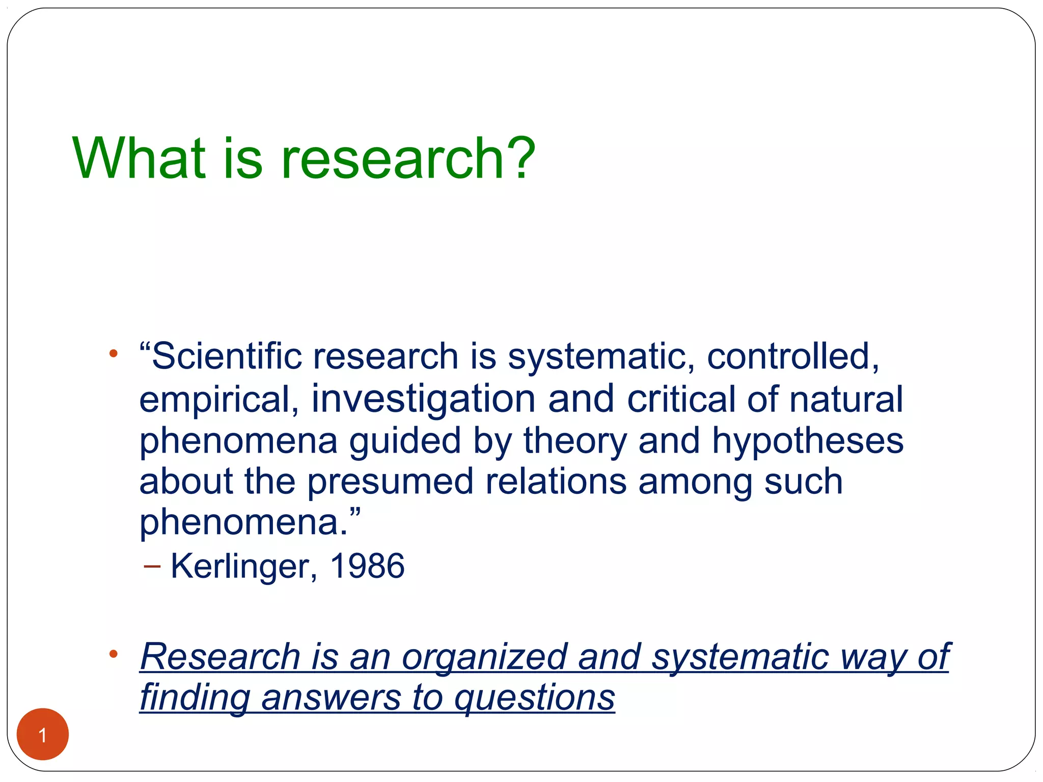 Research is defined as a systematic, empirical investigation guided by theory to understand natural phenomena. It involves identifying a problem, reviewing existing literature, developing hypotheses and variables, collecting and analyzing data, and drawing conclusions. There are important components to research including the research design, methodology, instrumentation, sampling, data analysis, and conclusions. Sampling involves selecting a subset of a population to study. Probability sampling aims to give all population members an equal chance of selection, while non-probability sampling does not. Common probability sampling methods include simple random sampling, systematic sampling, stratified sampling, cluster sampling, and multistage sampling.