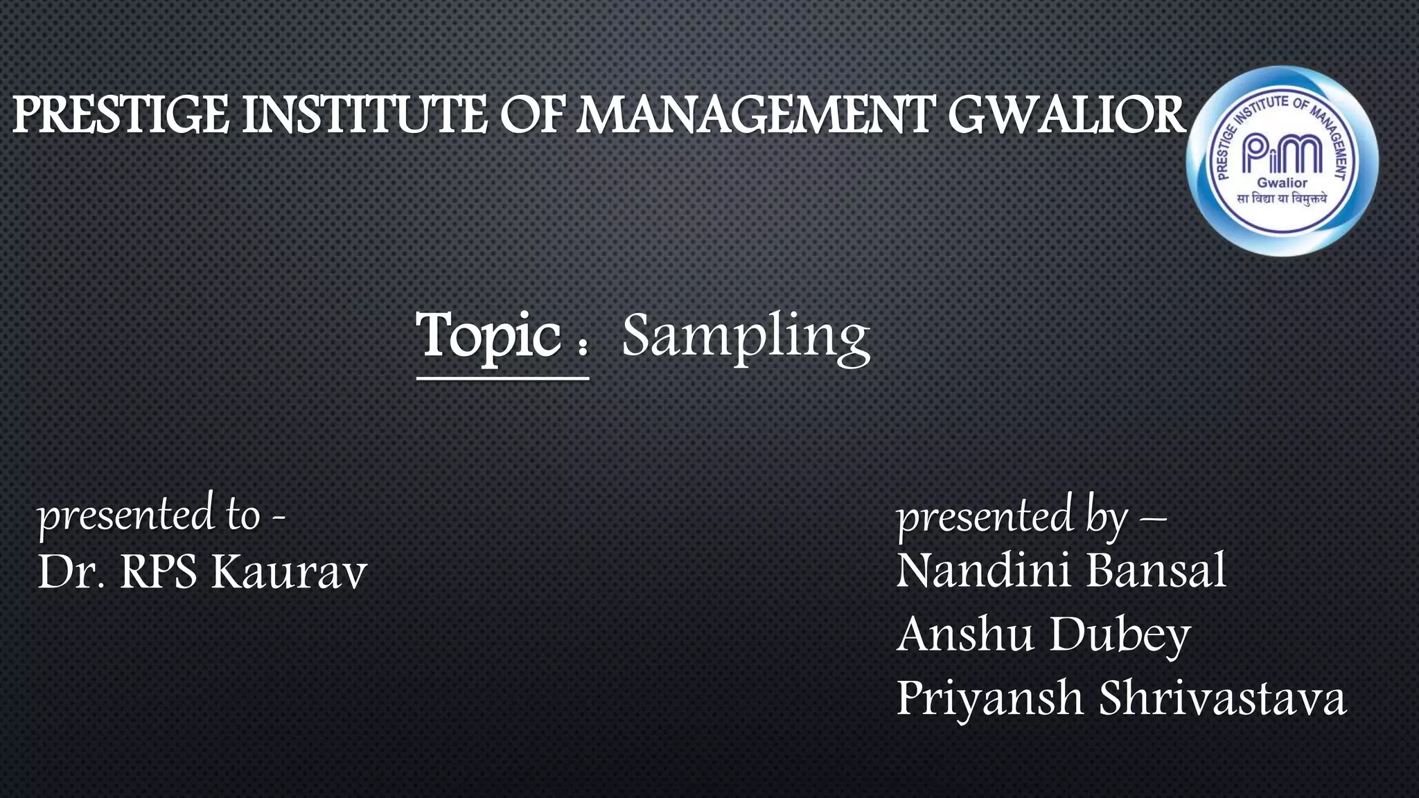 The document presents a report from the Prestige Institute of Management, Gwalior, focusing on various sampling methods, including simple random, systematic, cluster, stratified, purposive, convenience, snowball, and quota sampling. It was presented by Nandini Bansal, Anshu Dubey, and Priyansh Shrivastava to Dr. RPS Kaurav. The focus is on explaining these diverse sampling techniques.