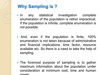 The document discusses the concept of sampling in statistical investigations, detailing the sampling process, types of samples, and the reasons for using sampling over complete enumeration. It categorizes populations into finite and infinite types and explains various sampling methods, including probability and non-probability techniques. Additionally, it addresses the determination of sample size and identifies sampling and non-sampling errors that may occur during data collection and analysis.