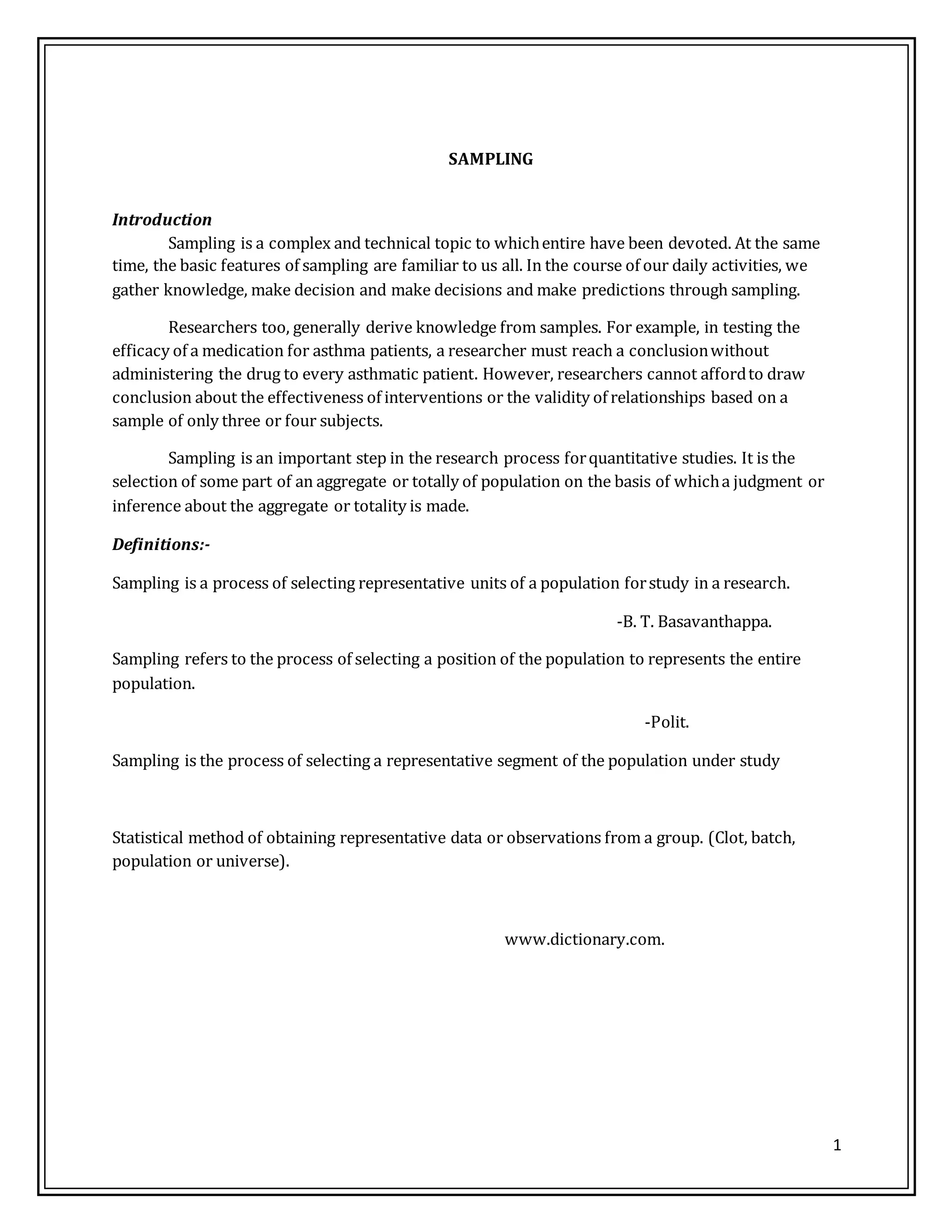 This document discusses sampling methods used in research. It defines key terms like population, sample, sampling, and sampling techniques. It explains that sampling involves selecting a representative segment of the population to study. The main types of sampling techniques discussed are probability sampling methods like simple random sampling and stratified random sampling, and non-probability sampling methods. It provides details on how to implement simple random sampling and stratified random sampling, along with their merits and limitations. The document emphasizes that the goal of sampling is to select a sample that accurately represents the population.