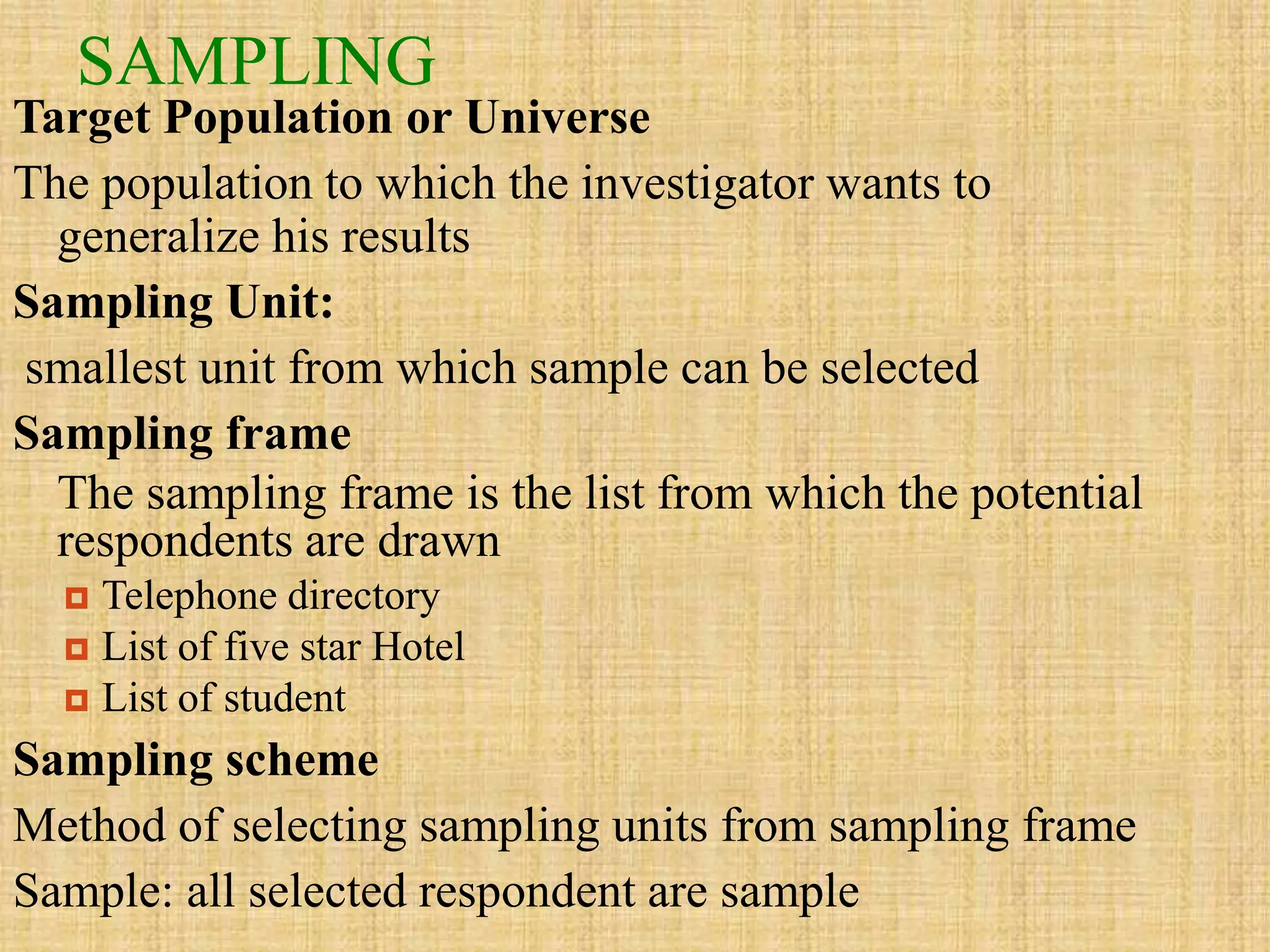 The document discusses key concepts in sampling, including: