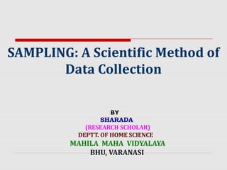 This document discusses various sampling methods used for data collection. It defines key terms like population, sample, parameter, and statistic. It describes probability sampling methods like simple random sampling, stratified sampling, cluster sampling, systematic sampling, and multistage sampling. It also discusses non-probability sampling methods such as convenience sampling, purposive sampling, quota sampling, snowball sampling, and self-selection sampling. The document concludes by explaining the different types of sampling errors like sample errors and non-sample errors.