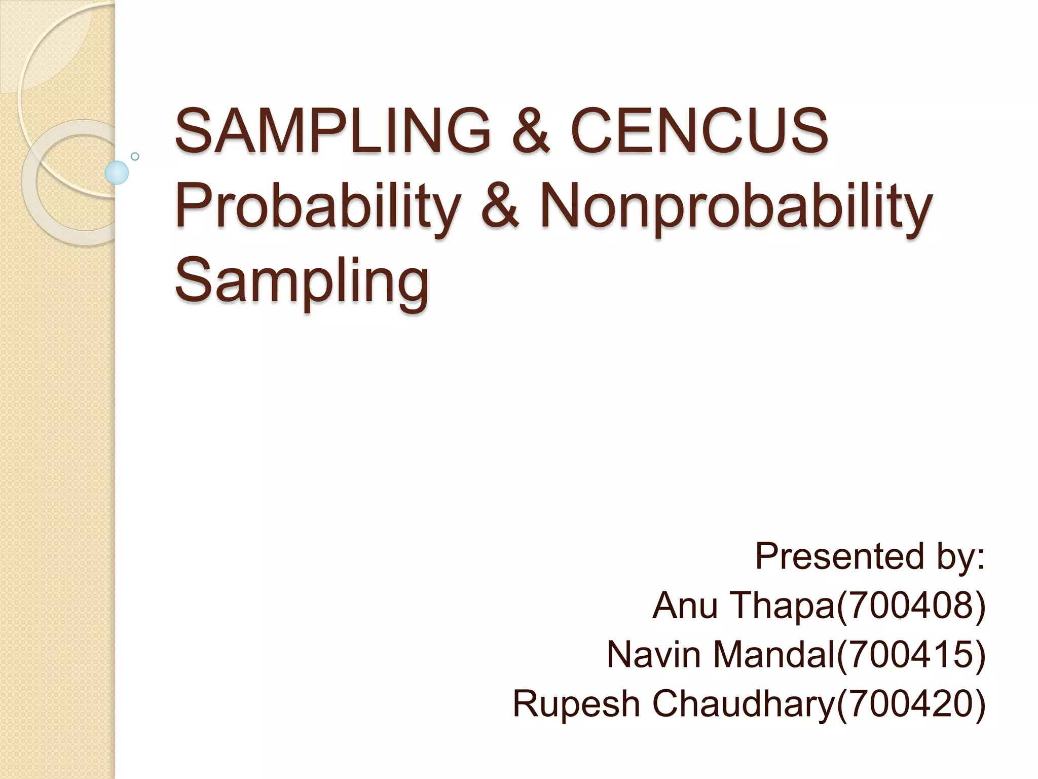 This document discusses different sampling methods used in research studies. It describes probability sampling methods like simple random sampling, systematic sampling, and stratified sampling which involve random selection. It also covers non-probability sampling techniques such as judgmental sampling, accidental sampling, quota sampling, and convenience sampling which do not use random selection. The key advantages of sampling over a census are lower cost, faster data collection, and feasibility when the entire population cannot be studied. However, sampling results in less accuracy than a census due to potential errors.