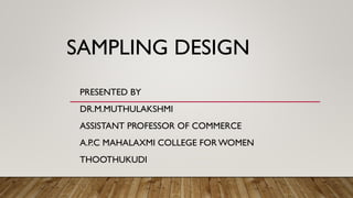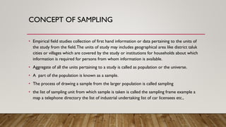 This document discusses different sampling techniques used in research studies. It begins by defining key concepts like population, sample, and sampling frame. It then distinguishes between census and sampling. Some characteristics of a good sample are representativeness, accuracy, precision and size. Factors to consider when choosing between census and sampling include population size, time, funds and facilities available. Advantages of sampling are reduced time, cost and better quality results. Limitations include potential for incorrect results and difficulty ensuring representativeness. Common sampling techniques discussed are probability/random sampling and non-probability sampling, with simple random sampling, stratified sampling, systematic sampling and cluster sampling provided as examples within probability sampling.