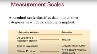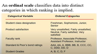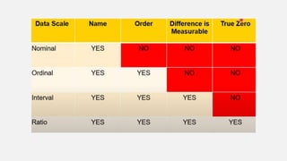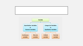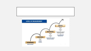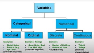 This document provides an overview of topics to be covered in Week 2, including sampling error, types of statistics, types of variables, and a class practice activity. It discusses how sampling error is the naturally occurring discrepancy between a sample statistic and the corresponding population parameter. It also describes descriptive statistics as techniques used to summarize and organize raw data, often through tables and graphs, while inferential statistics allow making generalizations about populations from sample data. Examples are provided of independent and dependent variables that could be measured in a plant study. Finally, different types of variable scales are defined.