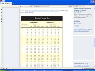 The document discusses sampling in research. It defines a sample as a small representative segment of a population from which inferences can be drawn about the larger population with minimal resources. Factors that influence sample size include population characteristics, study design, and desired statistical power and significance level. Common sampling techniques include simple random sampling, systematic random sampling, stratified random sampling, and cluster random sampling. Sample size calculations depend on the type of data and study design.