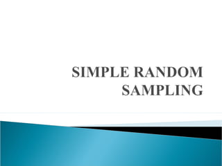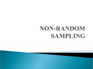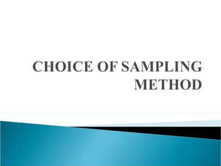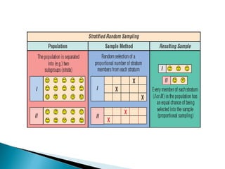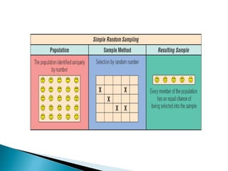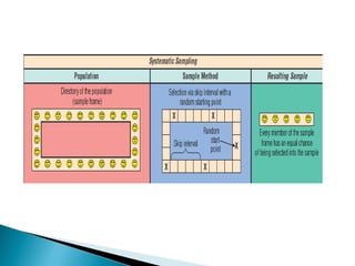 This document discusses various sampling methods used in research. It begins by defining key sampling terms like population, sample, sampling unit, and sampling frame. It then describes the main types of sampling: probability sampling methods which use random selection and allow statistical inference about the population, and non-probability sampling methods which do not use random selection. Specific probability methods discussed include simple random sampling, systematic random sampling, stratified random sampling, cluster sampling, and multistage sampling. Common non-probability methods mentioned are convenience sampling, purposive sampling, and snowball sampling. The document provides details on how to implement several of these sampling techniques and notes their relative advantages and limitations.