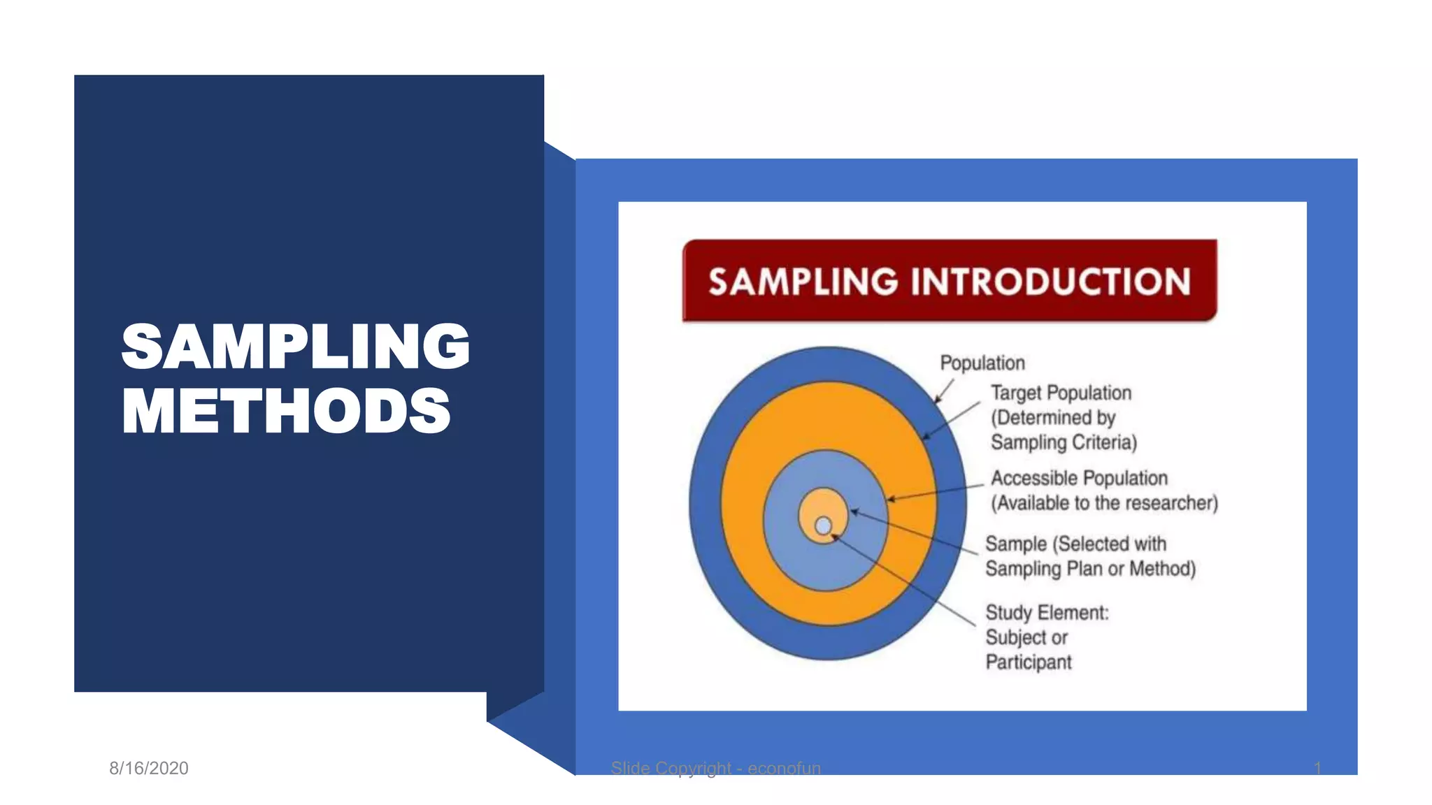 The document discusses various sampling methods, highlighting visual understanding and lottery methods with random number generation. It includes illustrations and examples, such as candies sorted by colors, to enhance comprehension. The content is copyright protected by Econofun and dated August 16, 2020.