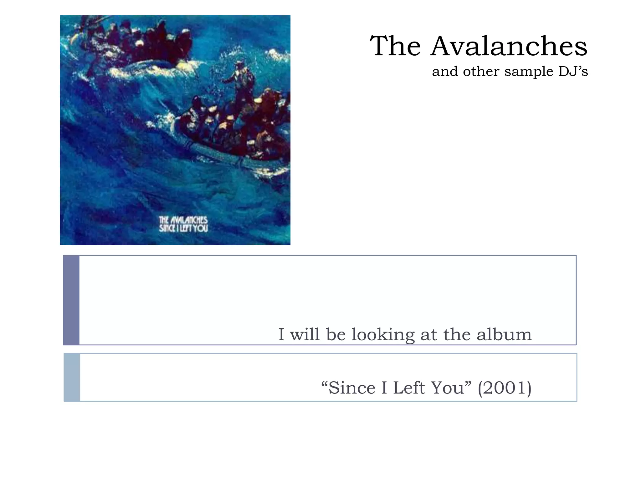 The document discusses the 2001 album "Since I Left You" by the Australian electronic music group The Avalanches. The album is composed entirely of samples from other songs and sources, using over 3,500 vinyl samples. It was originally conceived as a concept album about an international love story. Two tracks from the album, "Since I Left You" and "Frontier Psychiatrist" are highlighted as examples of the wide range of samples used. The document also discusses how dubstep music has furthered the postmodern tradition of extensive sampling and remixing of existing music.