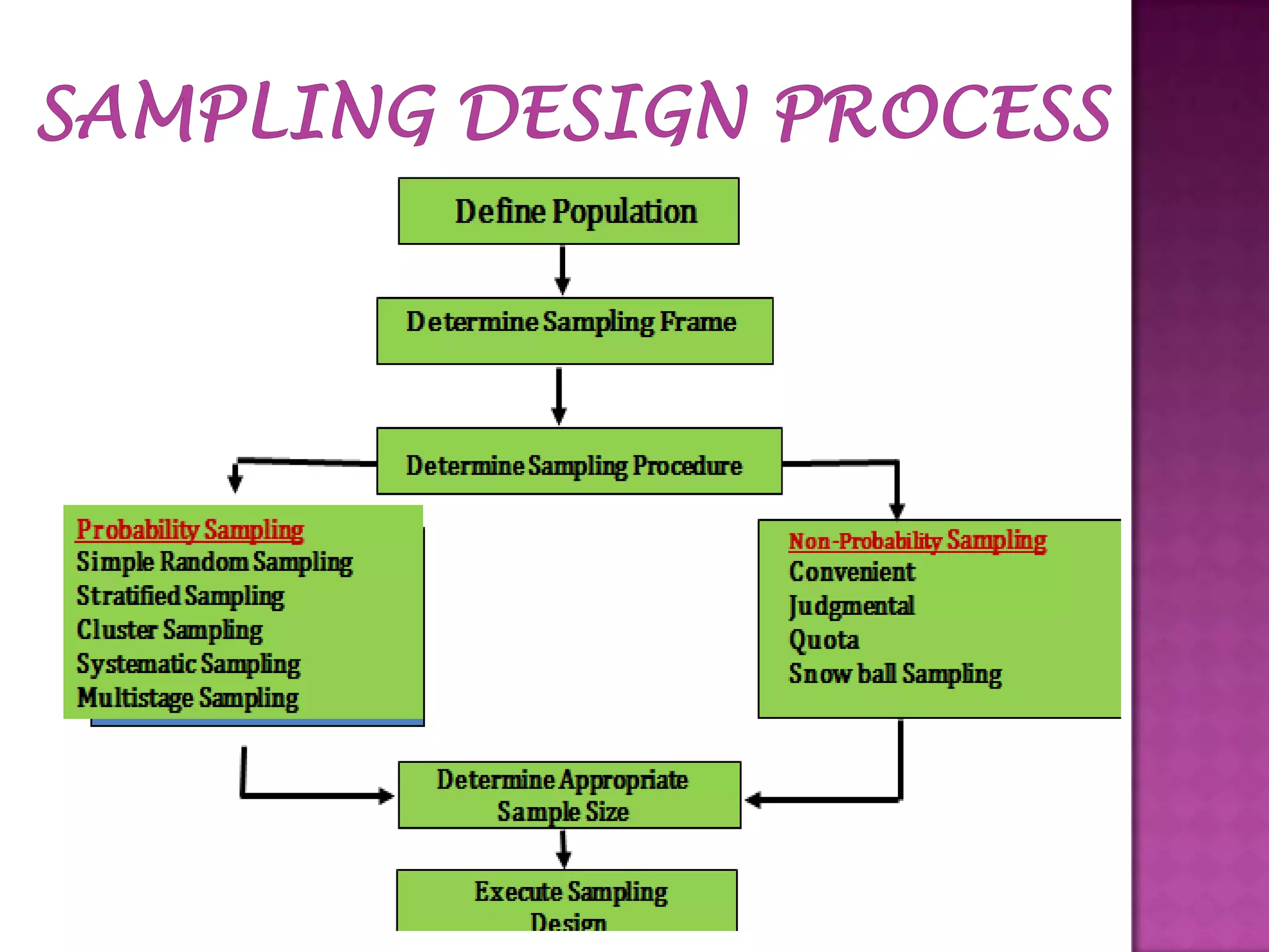 Sampling is the process of selecting a subset of individuals from within a population to estimate characteristics of the whole population. There are several sampling techniques including simple random sampling, stratified sampling, cluster sampling, systematic sampling, and non-probability sampling. Each technique has advantages and disadvantages related to accuracy, cost, and generalizability. Proper sampling helps reduce sampling errors and increase the reliability of making inferences about the population from a sample.
