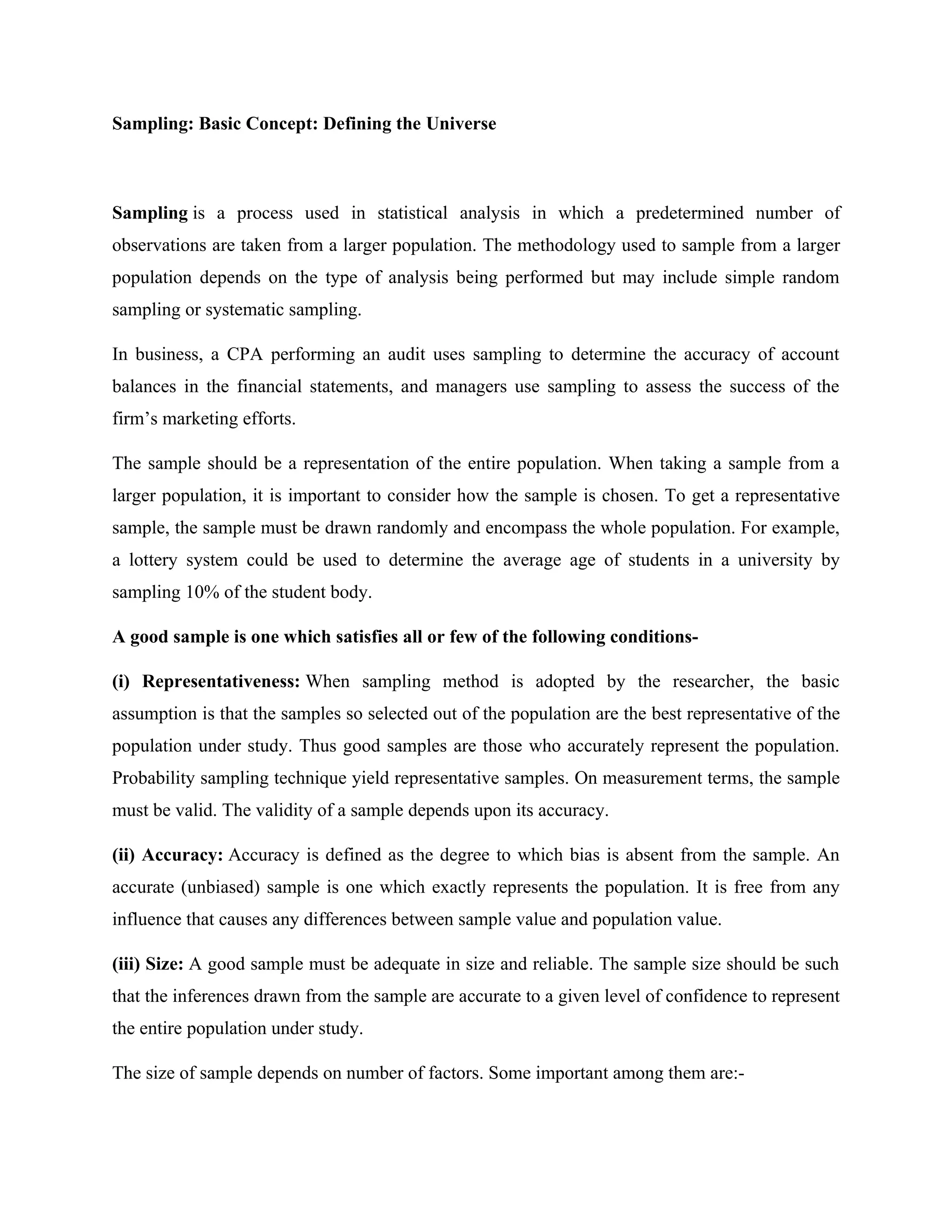 (iii) Size: A good sample must be adequate in size and reliable. The sample size should be such