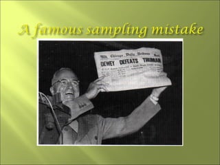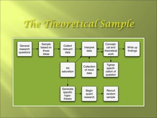 This document discusses key concepts related to sampling in research studies. It defines population as the larger group being studied, and sample as the subset of individuals selected for a study. There are different types of sampling methods discussed, including probability sampling which allows calculation of sampling error, and non-probability sampling which is less expensive but does not allow generalization. The document emphasizes that sample size depends on achieving saturation in qualitative research versus statistical validity in quantitative research. Sources of error like sampling error and bias are also outlined.