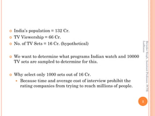 The document discusses sampling and sampling distributions for estimation. It notes that sampling is used when the population is too large to observe entirely, like India's population of TV viewers. Random sampling of 10,000 TV sets is used to determine viewing preferences. The chapter examines questions around sample size, selection methods, and knowing when a sample accurately reflects the population. Simple random sampling, systematic sampling, stratified sampling and cluster sampling are probability sampling methods discussed. The central limit theorem states that as sample size increases, the sampling distribution of means approaches a normal distribution.