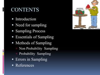 This document provides an overview of sampling techniques. It defines key sampling terms like population, sample, sampling frame, and discusses the need for sampling due to constraints of time and money for a full census. The document outlines different sampling methods like simple random sampling, stratified sampling, cluster sampling and multistage sampling. It also discusses non-probability sampling techniques like convenience sampling and snowball sampling. The document emphasizes the importance of representativeness, adequacy and independence for a good sample. It concludes by noting sources of error in sampling like sampling errors and non-sampling errors.