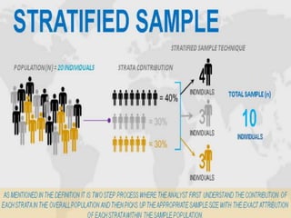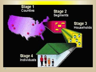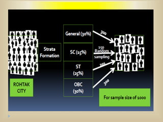 The document outlines various sampling techniques and their significance in research, distinguishing between probability and non-probability sampling methods. It details the merits and demerits of different sampling designs such as simple random sampling, stratified sampling, cluster sampling, and more, alongside statistical concepts such as parameters and sampling errors. The text emphasizes the importance of proper sampling methods for accurate statistical inference and the challenges of obtaining representative samples.