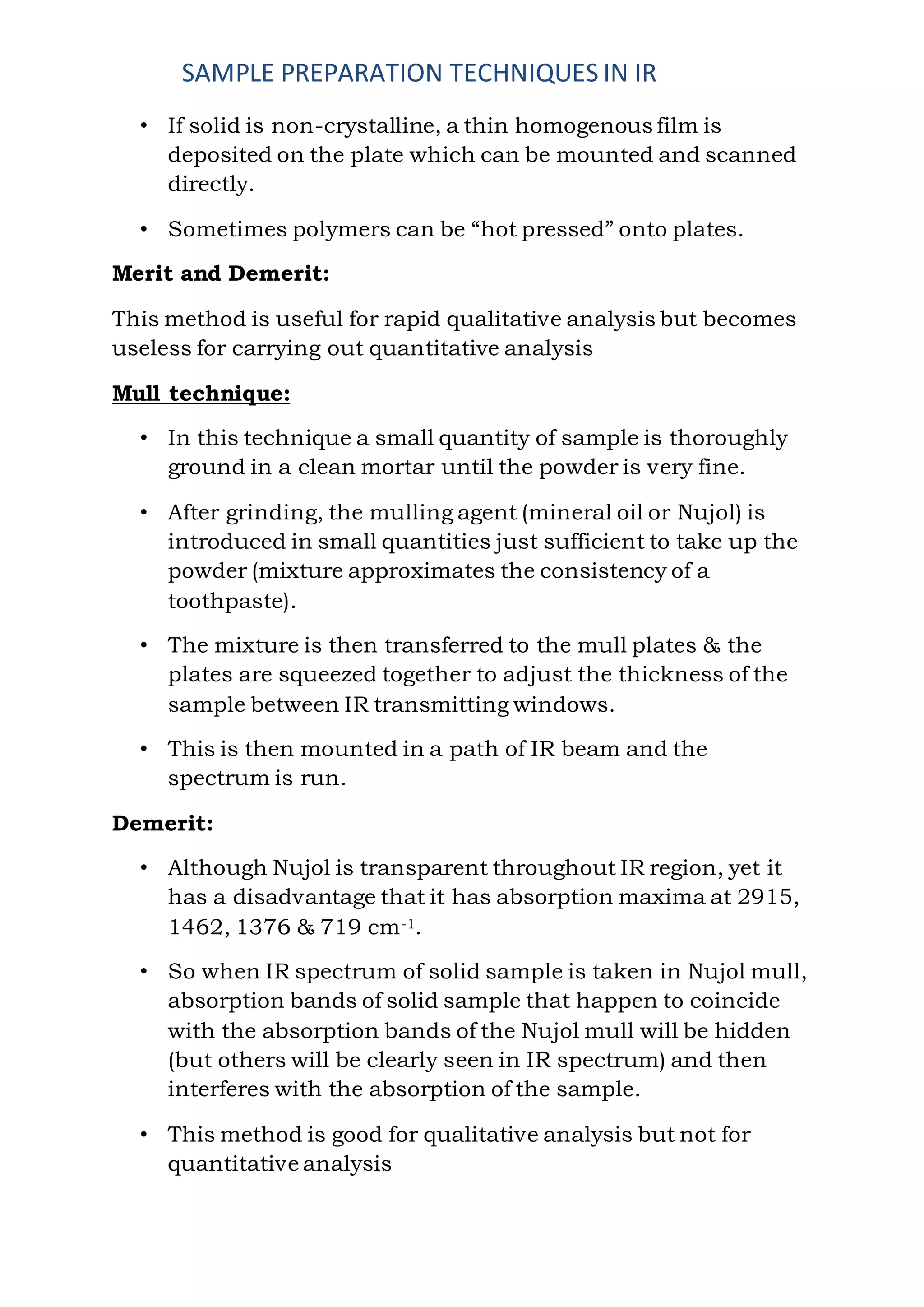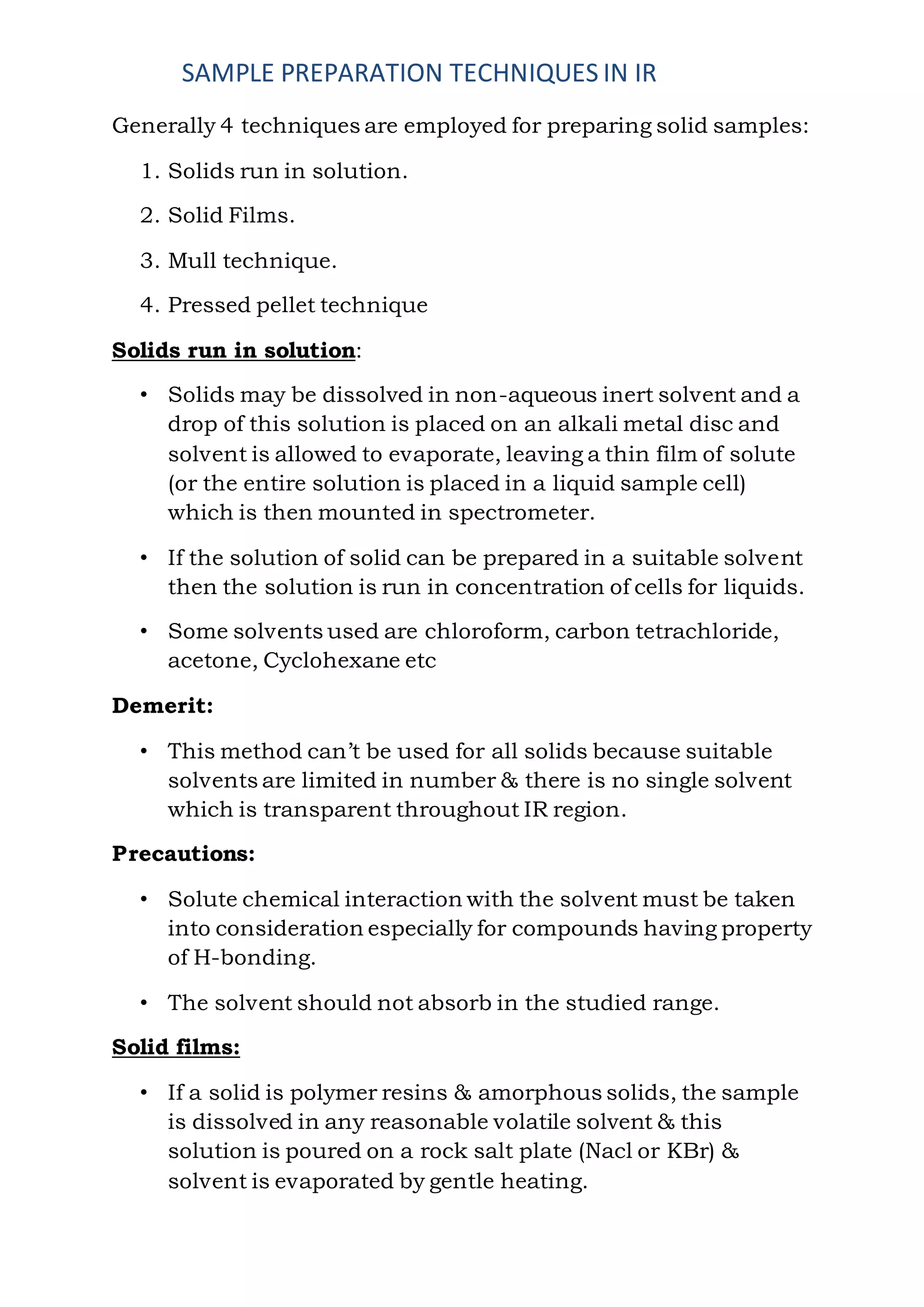 There are four main techniques used to prepare solid samples for IR spectroscopy: dissolving solids in solution, solid films, mull technique, and pressed pellet technique. The mull technique involves grinding the solid sample with a mulling agent like mineral oil or nujol to form a paste between IR windows. The pressed pellet technique uses potassium bromide to form a compressed pellet, avoiding interference from a mulling agent. Liquids can be analyzed directly in liquid sample cells of appropriate thickness.