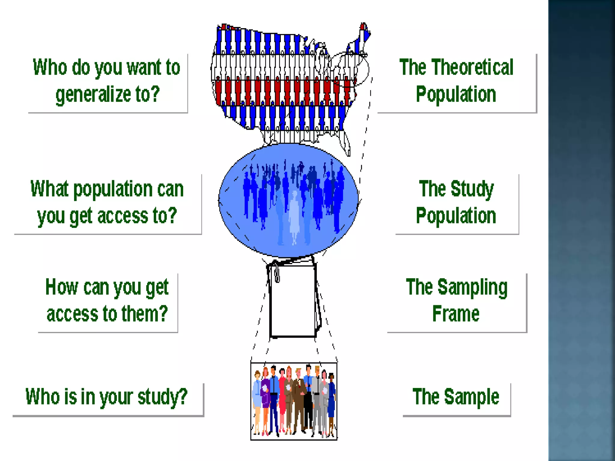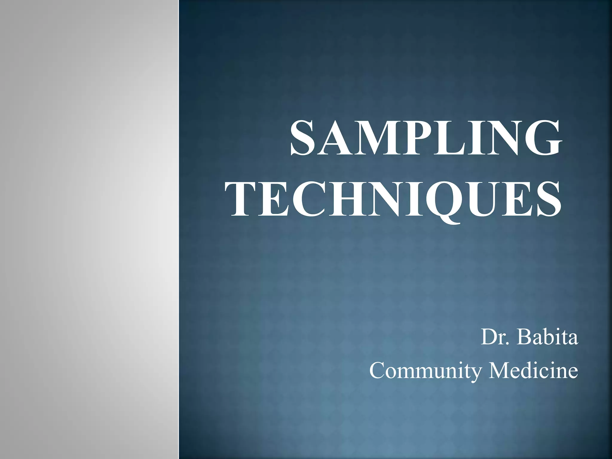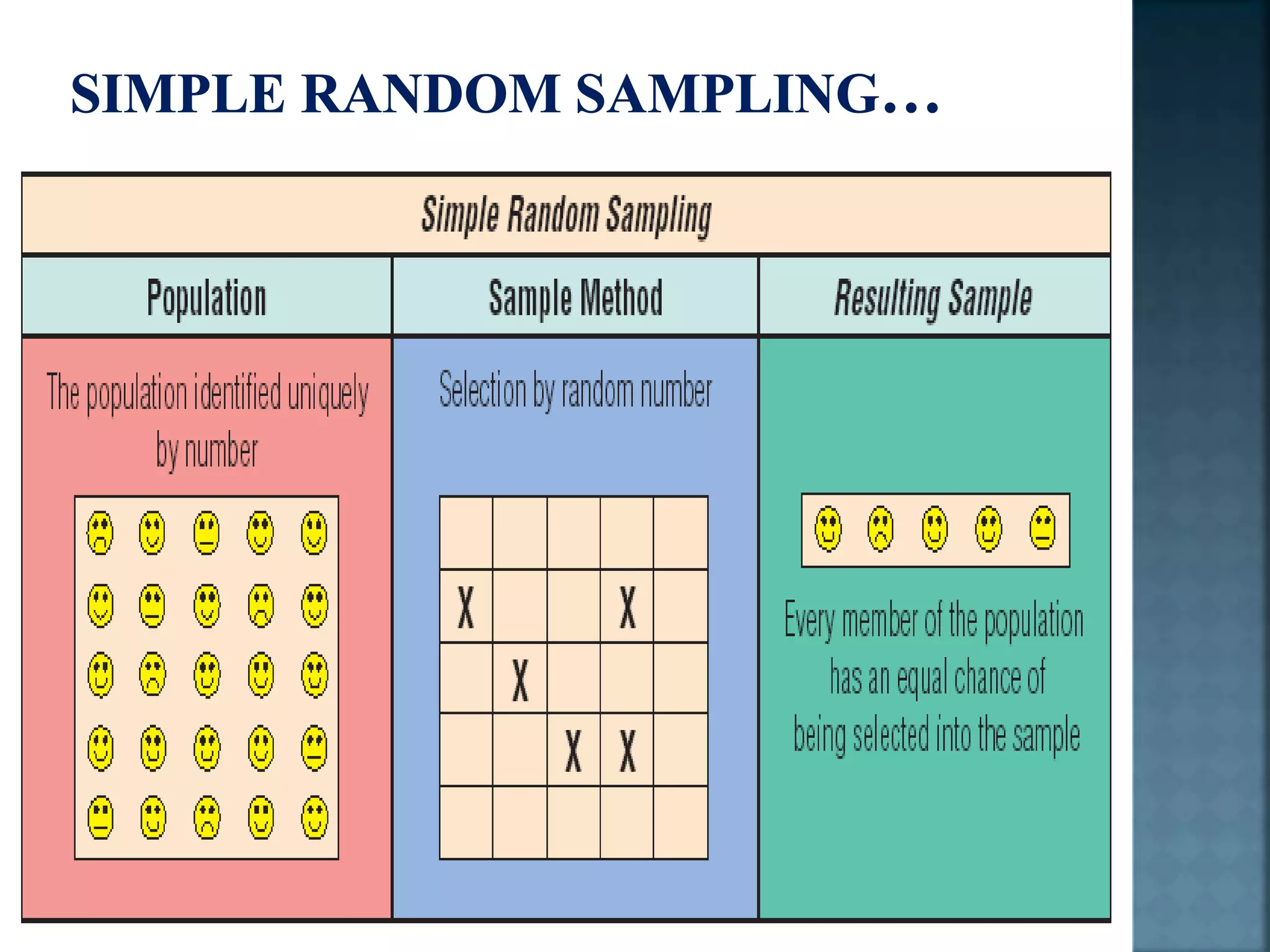 The document discusses sampling methods and concepts. It defines key terms like population, sample, sampling frame and sampling error. It describes different types of sampling including probability sampling methods like simple random sampling, systematic random sampling and cluster sampling. It also discusses non-probability sampling and factors to consider in determining sample size. The document provides guidance on calculating sampling error and outlines principles of good sampling.