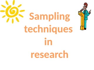 The document discusses various sampling techniques in research, defining population and sample while highlighting the importance of sampling for accuracy, efficiency, and control of errors. It categorizes sampling methods into probability and non-probability techniques, detailing their advantages and disadvantages, including approaches like simple random, stratified, systematic, cluster, and purposive sampling. The text contrasts the circumstances favoring the use of each type based on the nature of research and operational considerations.