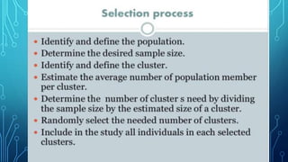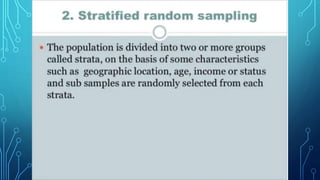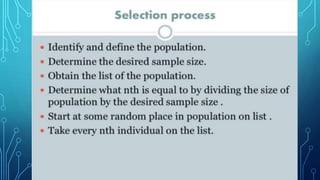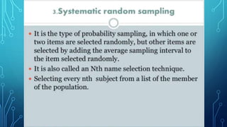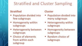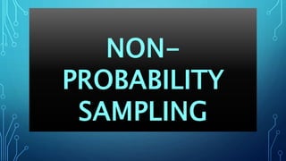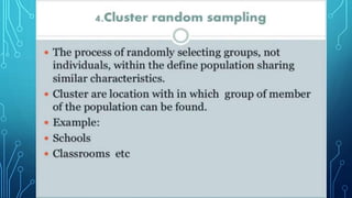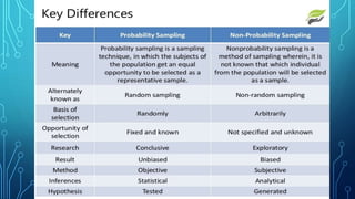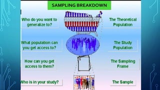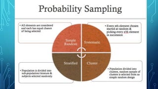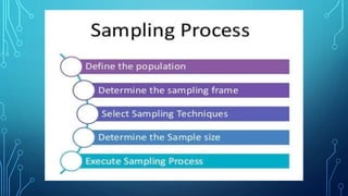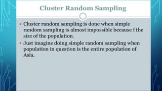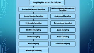 The document discusses the concepts of population, sampling frames, and the various types of sampling units used in research. It highlights the differences between probability and non-probability sampling methods and emphasizes the importance of representativeness and sample size. Additionally, it mentions the necessity of using primary data collection when secondary data is unavailable.