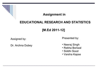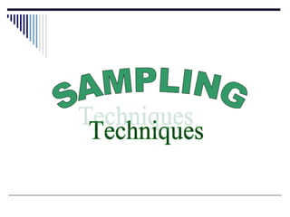 This document discusses sampling techniques used in educational research. It begins by defining key terms like population, sample, and sampling techniques. It then describes probability sampling methods like systematic sampling and non-probability sampling methods like purposive sampling. For systematic sampling, every kth unit is selected from an ordered population. Purposive sampling involves selecting units that are relevant to the research objectives. The document outlines the advantages and limitations of these sampling methods.