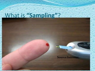 Sampling is the process of selecting a subset of individuals from within a population to estimate characteristics of the whole population. It is done because examining the entire population would be impossible or impractical in terms of time, cost, and effort. There are two main types of sampling: probability sampling, where every member of the population has a chance of being selected; and non-probability sampling, which does not use random selection. Some common sampling techniques include simple random sampling, stratified random sampling, cluster sampling, and systematic random sampling. Issues to consider with sampling include sampling error and sampling bias.