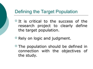 The document discusses various sampling methods essential for research, emphasizing the importance of defining the target population and understanding key concepts like sampling frames, census samples, and strata. It differentiates between probability and nonprobability sampling techniques, detailing methods such as random, stratified, and cluster sampling, alongside nonprobability methods like convenience and judgment sampling. Additionally, it highlights common sampling errors and the effects of response rates on the integrity of research findings.
