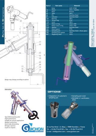 The document describes a compact sampling valve type 616M that features a cast body with a conical piston seating hard faced with stellite for better tightness and longer lasting sealing. It has a back seat and piston tightness with an FEP encapsulated viton o-ring for low maintenance, easy cleaning, and low contamination risks. The valve allows for direct sampling in the process flow with a sampling pot that has a quick disconnector and polished internal and external surfaces.