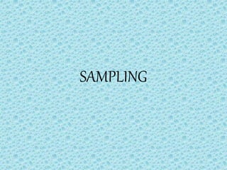 Sampling is a process used in statistical analysis where a predetermined number of observations are taken from a larger population. There are two main sampling methods: probability sampling, which uses random selection, and non-probability sampling, which uses non-random techniques. Probability sampling methods include simple random sampling, systematic sampling, stratified sampling, and cluster sampling. Non-probability sampling includes convenience sampling, quota sampling, judgemental/purposive sampling, and snowball sampling. The advantages of sampling include lower cost, less time consumption, and higher accuracy of data collection, while disadvantages include potential for bias and inability to select truly representative samples.