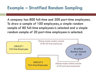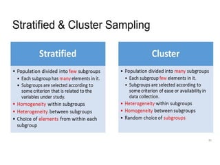 This document discusses different sampling methods used in research. It defines sampling as selecting a small number of cases from a larger population to make inferences about the whole population. There are two main types of sampling: probability sampling, which uses random selection so each member has an equal chance of being chosen; and non-probability sampling, which relies on the researcher's judgment and cannot be used to generalize to the whole population. Common probability methods include simple random, stratified, cluster, and systematic sampling. Common non-probability methods are convenience, judgmental, snowball, and quota sampling.