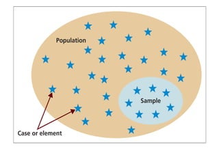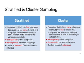 This document discusses sampling and various sampling methods. It defines sampling as selecting a small group from a larger population to make inferences about the whole population. There are two main types of sampling methods: probability and non-probability. Probability methods like simple random, stratified, cluster, and systematic sampling give reliable representations if done correctly. Non-probability methods like convenience, judgmental, snowball, and quota sampling rely on researcher judgment and cannot be generalized. The document provides details on each sampling technique.