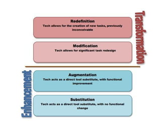 This document provides examples of how teachers can implement the SAMR model in their classrooms using technology. It begins with definitions of the different levels of the SAMR model from substitution to redefinition. Several classroom scenarios are then described and categorized based on their appropriate SAMR level. These scenarios range from using online tools like Google Docs for collaboration to simulations and games that redefine traditional classroom tasks.