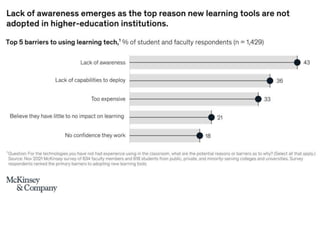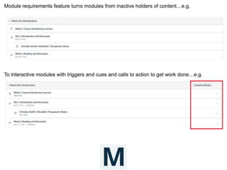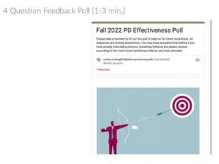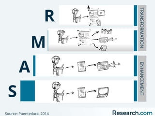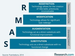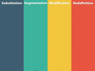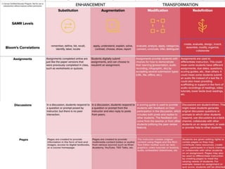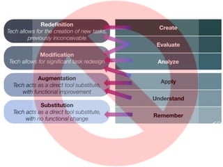 This document presents the SAMR model for technology integration in online courses. The SAMR model identifies four levels of technology integration: substitution, augmentation, modification, and redefinition. It is presented as a framework to help instructors evaluate how they currently use technology in their course and identify opportunities to move up the levels towards more transformative uses of technology. The document also includes self-reflection and group reflection questions. Benefits of technology integration are noted such as remedying weaknesses, promoting skills, and supporting self-paced learning. Other technology integration models are also briefly presented.