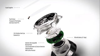 The document discusses smartwatches, which are wrist-watches that provide an extension of smartphone functionality via Bluetooth. It describes how smartwatches originated from comic strips in the 1940s and were first commercially introduced in 2004. It then lists the various sensors, features, specifications, advantages, disadvantages, uses, and companies that produce smartwatches. In conclusion, it predicts that the disadvantages of smartwatches will decrease as the industry continues to grow and improve the technology.